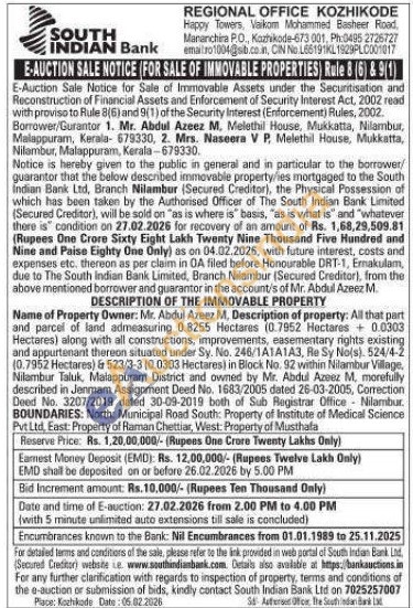 DESCRIPTION OF THE IMMOVABLE PROPERTY : Name of Property Owner: Mr. Abdul Azeez M. Description of property: All that part and parcel of land admeasuring 0.8255 Hectares (0.7952 Hectares + 0.0303 Hectares) along with all constructions, improvements, easementary rights existing and appurtenant thereon situated under Sy. No. 246/1A1A1A3, Re Sy No(s). 524/4-2 (0.7952 Hectares) & 523/3-3 (0.0303 Hectares) in Block No. 92 within Nilambur Village, Nilambur Taluk, Malappuram District and owned by Mr. Abdul Azeez M, morefully described in Jenmam Assignment Deed No. 1683/2005 dated 26-03-2005, Correction Deed No. 3207/2019 dated 30-09-2019 both of Sub Registrar Office Nilambur. BOUNDARIES: North: Municipal Road South: Property of Institute of Medical Science Pvt Ltd, East: Property of Raman Chettiar, West: Property of Musthafa