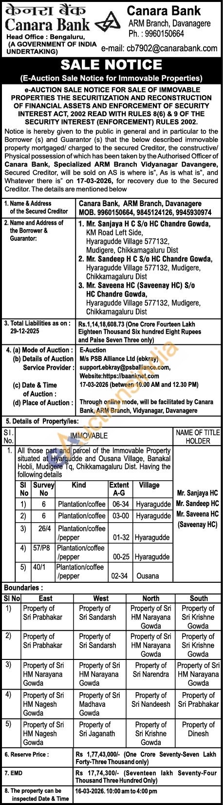 All those part and parcel of the Immovable Property situated at Hyargudde and Ousana Village, Banakal Hobli, Mudigere Tq, Chikkamagaluru Dist. Having the following details
