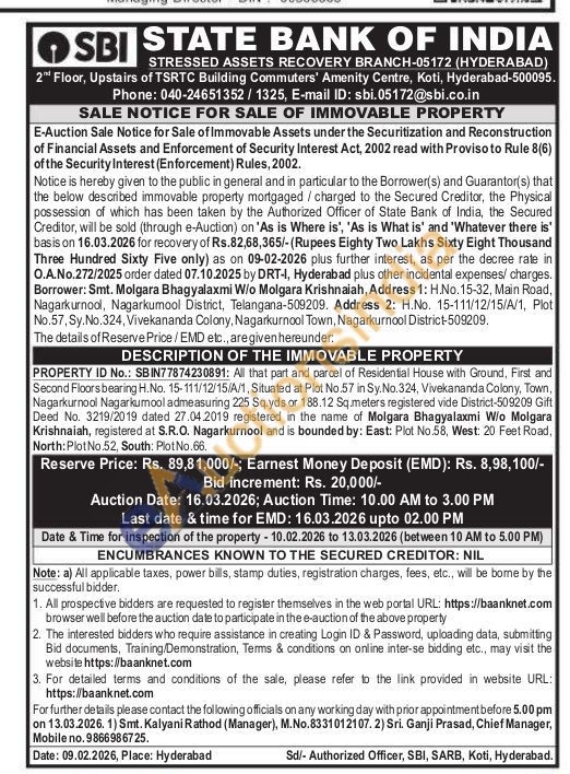 PROPERTY ID No.: SBIN77874230891: All that part and parcel of Residential House with Ground, First and Second Floors bearing H.No. 15-111/12/15/A/1, Situated at Plot No.57 in Sy.No.324, Vivekananda Colony, Town, Nagarkurnool Nagarkurnool admeasuring 225 Sq.yds or 188.12 Sq.meters registered vide District-509209 Gift Deed No. 3219/2019 dated 27.04.2019 registered in the name of Molgara Bhagyalaxmi W/o Molgara Krishnaiah, registered at S.R.O. Nagarkurnool and is bounded by: East: Plot No.58, West: 20 Feet Road, North: Plot No.52, South: Plot No.66.