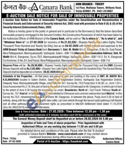 Schedule of the Properties: All that piece and parcel of land and building in the name of SMT. M. MATHI W/o K.ELANGOVAN located in Salem District, Salem East Registration District, Vazhapady Sub Registration District, Valapady Taluk, Mannayakkanpatty Village, Joint Patta No. 341. Survey No. 70/2 Punja Hect. 0.50.00, ie., Acre 1.23 1/2 Cess/Assessment Rs.2.78, this part of land to the extent of Acre 0.53 belonged to Mr. Elangovan, in which part of land to the extent of Acre 0.30 having the boundaries as under; Boundaries: North of: Cart-Track/Pathway South of: Survey No. 70/1 East of: In Survey No. 70/2, land allotted to Chinnavan and common well portion land West of: In this Survey No.70/2, remaining holding land of Donor Mr. Elangovan. In between the above, Punja Acre 0.30 of land of entirety, along with the rights to use and/or take cattle, cart and vehicle through the layout roads/pathways left therein and all other pathway rights and easement rights as prescribed in title/Gift Settlement Deed dated 11.10.2018 (Doc. No.3803/2018) and its parent title deeds