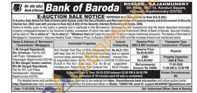 RCC Roofed Third Floor (3 BHK) Residential Flat with Near Door No 57-6-22, Plinth Area (Including common areas, balconies) -1600 Sift with undivided & unspecified share- 50 Sq. Yds, located in LEHI PLAZA in Plot No.1 (East Side), R.S. No 90 at Vishalapuram, Rajahmundry, East Godavari Dist