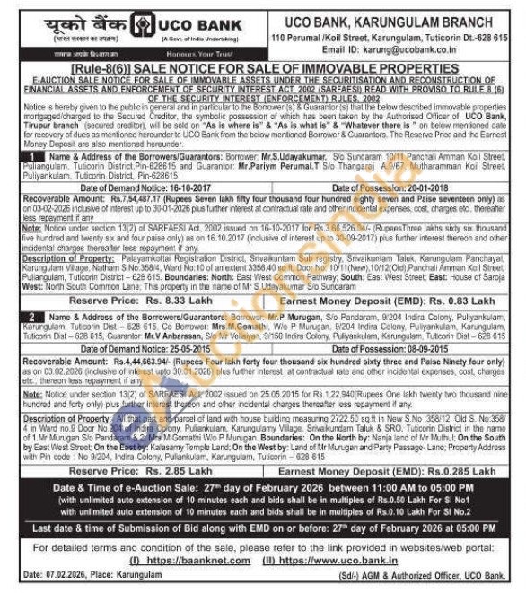 All that part and parcel of land with house building measuring 2722.50 sq ft in New S.No 358/12, Old S. No:358 4 in Ward no.9 Door No 204 of Indira Colony, Pulilankulam, Karungulamy Village, Srivalkundam Taluk & SRO, Tuticorin District in the name of 1.Mr Murugan Sio Pardaram &2. Mrs M Gomathi Wio P Murugan. Boundaries: On the North by: Nanja land of Mr Muthul: On the South by East West Street: On the East by: Kalasamy Temple Land. On the West by: Land of Mr Murugan and Party Passage-Lane, Property Address with Pin code: No 9/204, Indira Colony, Pullankulam, Karungulam, Tuticorin-928 615