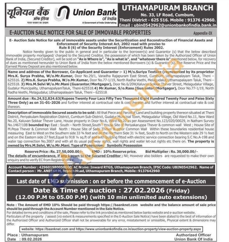All that Piece and Parcel of Land and building property thereon situated at Theni District, Periyakulam Registration District, Cumbum Sub-District, Gudalur Muncipal Town, Melagudalur Village, Old Ward No.11, New Ward No.20, Kaluvan Sokkar Thever Lane, House property in Door No.6, Ward No.20 as per Assessment No. 123/020/00029, in Natham Survey No. 1467/10B bounded by: East: South-North Street, South: House Site of Periyakaruppa Thever & common wall West; House Site of M.Peya Thever & Common Wall North House Site of Sami Thever & other Common Wall Within these boundaries residential house measuring East to West on the Southern side 33% feet and on the Northern Side 31% feet, South to North on the Western side 29 ½ feet and on the Eastern side 27 feet, Equal to 918 4 sq.ft of and with building fitted with electric service connection bearing S.C No.A-198 and water tap connection No.3007 and with all its usual pathway rights, wall rights and water let-out rights etc there on. The property is owned by Mrs.M.Selvi, W/o.Mr.Mani. Type of Possession: Symbolic Possession