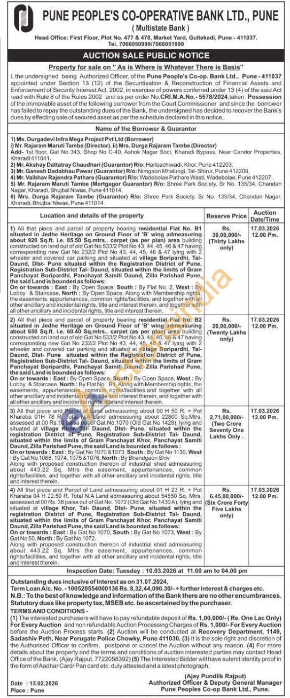4) All that piece and Parcel of Land admeasuring about 01 H 23 R. Pot Kharabe 04 H 22.50 R. Total NA Land admeasuring about 54550 Sq. Mira. assessed at 00 Rs. 38 paisa out of Gat No. 1072 (Old Gat No 1430 A), lying and situated at village Khor, Tal- Daund, Dist- Pune, situated within the registration District of Pune, Registration Sub-District Tal- Daund. situated within the limits of Gram Panchayat Khor, Panchayat Samiti Daund, Zilla Parishad Pune, the said Land is bounded as follows: On or towards: East: By Gat No 1070, South By Gat No 1073, West: By Gat No 50, North: By Gat No 1072 Along with proposed construction thereon of industrial shed admeasuring about 443.22 Sq. Mirs the easement, appurtenances, common rights/facilities, and together with all other ancitary and incidental rights, title and interest therein