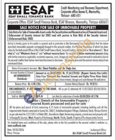All the pios mo pomal of land measuring 4.15 Coats of immunobis property including building and all the improvements trenin comprised in Survey No. 280/2, Vodakkumbaghem Vilage, Chalakudy Talk, Thrissur District spersale deed No. 1227/2017 of Mala SRO, Boundaries. East: Remaining snpetty, private way and property sold to Kamppilly Soumya, West Propery of Orphanage, North Thodu, South Property of Punchporanito Family
