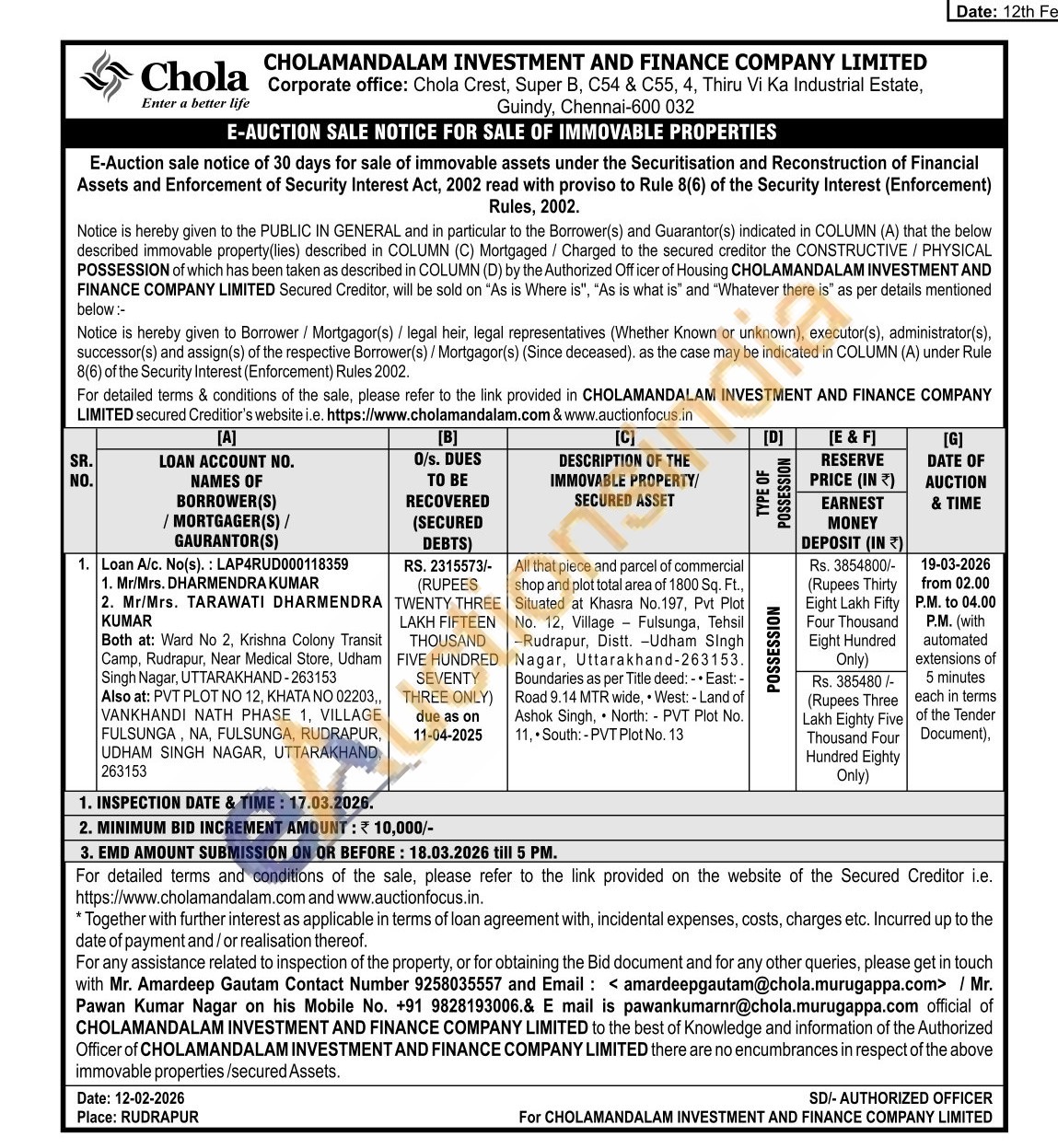 All that piece and parcel of commercial shop and plot total area of 1800 Sq. Ft., Situated at Khasra No.197, Pvt Plot No. 12, Village Fulsunga, Tehsil -Rudrapur, Distt. Udham Singh Nagar, Uttarakhand-263153. Boundaries as per Title deed: East: -Road 9.14 MTR wide, West: - Land of Ashok Singh, North: PVT Plot No. 11, South:-PVT Plot No. 13