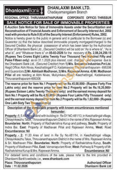 Property 2: 11.20 Ares of land in Re Sy No.481/14, in Keezhatlingal village. Chirayinkeezhu Taluk, Thiruvananthapuram District in the name of Mrs. Rajeswari Amma & Sri. Madhavan Pillai Boundaries: North: Property of Radhakrishna Kurup, South: Property of Madhavan Pillai, East: Vamanapuram River, West: Pathway & Property of Mr. Radhakrishna Kurup & Mrs. Rajeswan Amma
