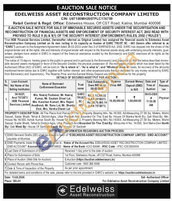 All The Piece And Parcel Of The 1. Property Bearing Min, No. 16/355, Ad-Measuring 27.58 Sq. Meters, Mishri Saiyad, Sadar Bhatti, Tehsil & District-Agra, Uttar Pradesh And Bounded On The: East By: House Of Manka North By. Gali West By: Min. House No. 16/355, Ashok Kumar South By: House Of Santosh 2. Property Bearing Min, No.16/355, Ad-Measuring 27.58 Sq. Meters, Mishri Saiyad, Sadar Bhatti, Tehsil & District-Agra, Uttar Pradesh And Bounded On The: East By: Minzumia H No. 16/355, Smt Maha Devi North By: Gall West By: House Of Santosh South By: House Of Santosh