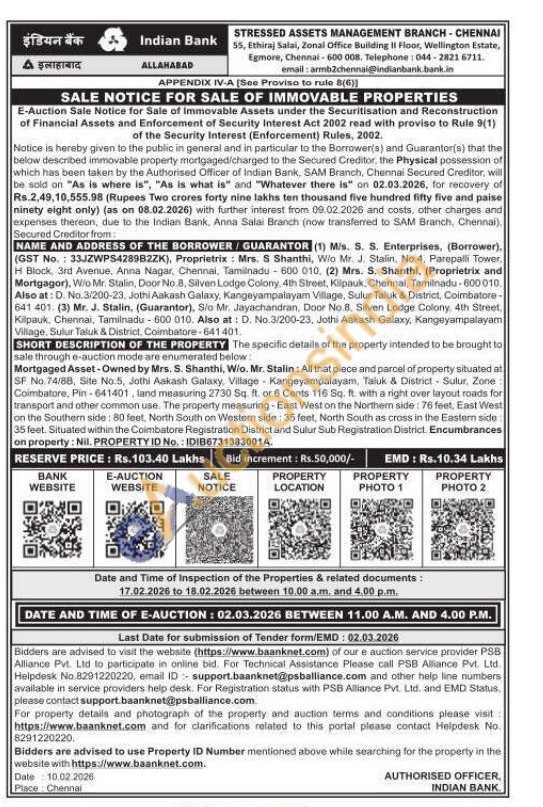 All that piece and parcel of property situated at SF No. 74/88, Site No.5, Jothi Aakash Galaxy, Village Kangeyampalayam, Taluk & District Sulur, Zone: Coimbatore, Pin-641401, land measuring 2730 Sq. ft. or 6 Cents 116 Sq. ft. with a right over layout roads for transport and other common use. The property measuring-East West on the Northern side: 76 feet, East West on the Southern side: 80 feet, North South on Western side: 35 feet, North South as cross in the Eastern side 35 feet. Situated within the Coimbatore Registration District and Sulur Sub Registration District. Encumbrances on property: NII. PROPERTY ID No.: IDIB6731383001A.
