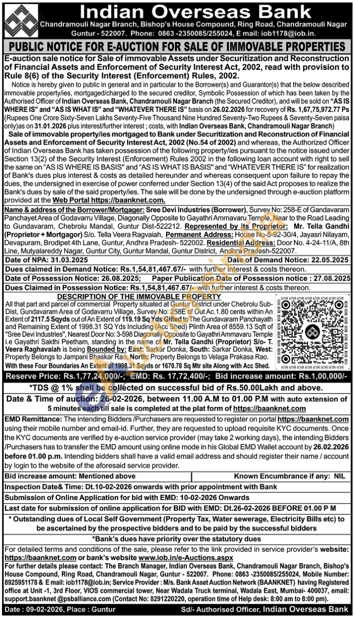 All that part and parcel of commercial Property situated at Guntur District under Chebrolu Sub-Dist, Gundavaram Area of Godavarru Village, Survey No: 258E of Out Ac. 1.80 cents within An Extent of 2117.5 Sqyds out of An Extent of 119.19 Sq Yds Gifted to The Gundavaram Panchayath and Remaining Extent of 1998.31 SQ Yds Including (Acc Shed) Plinth Area of 8559,13 Sqft of "Sree Devi Industries", Nearest Door No: 3-598 Diagonally Opposite to Gayathri Ammavaru Temple i.e Gayathri Sakthi Peetham, standing in the name of Mr. Tella Gandhi (Proprietor) S/o- T. Veera Raghavaiah is being Bounded by: East: Sarkar Donka, South: Sarkar Donka, West: Property Belongs to Jampani Bhaskar Rao, North: Property Belongs to Velaga Prakasa Rao. With these Four Boundaries An Extent of 1998.31 Sqyds or 1670.78 Sq Mtr site Along with Acc Shed