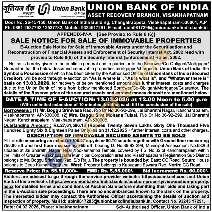 DESCRIPTION OF IMMOVABLE SECURED ASSETS TO BE SOLD : All the site measuring an extent of 108.47 sq.yds or 90.70 sq.mts together with Ground floor measuring 750.00 sft and first floor measuring 750 sft. bearing D. No.36-92-299, Municipal Assessment No.63266 situated at Jai Bharathi Nagar, Near Nookamamba Temple, covered by T.S. No.32 of Kancharapalem within the limits of Greater Visakhapatnam Municipal Corporation area and Visakhapatnam Registration Sub District belongs to Mr. Boggu Srinivasa Rao, S/o Raju. The property is bounded by: East: CC Road, South: House belongs to Deep Kumar Kongrana, West: Property belongs to Kapuganti Eswara Rao, North: CC Road