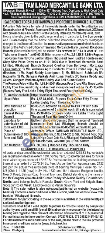 DESCRIPTION OF THE IMMOVABLE PROPERTY : All parts and parce's of the residential land to an extent of 1268.83 Sq. yards (As per registration deed an externt 1391.50 Sq. Yard, Road Affected area for future road widening an extent of 122.67 Sq Yards) and house building constructed there at to an extent of 2075.34 Sq. Feet (As per the Plan Approval) and 2422 (As per the actual measurement) there at bearing Municipal House No. 1-1-6/3 (Old) 1-1-125 (new) in Sv. No. 1639 and 1641 situated Eedgoan locality, Near X Road, Bainsa Road, Nirmal Town and District standing in the name of the Mr.Gangam Venkata Anil Kumar Reddy s/o Narsa Reddy. Boundaries: North: Land belongs to Akula Ramulu, South: Grave Yard and Eidgah, East: Sidcapur Road, West: Land belongs to Vanjar Sayanna