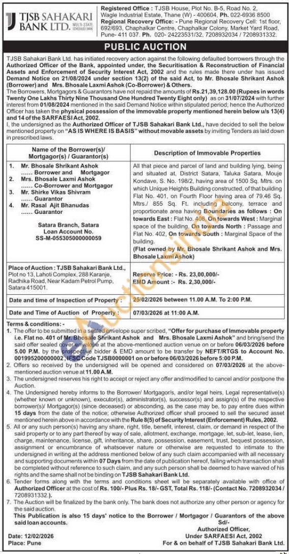 All that piece and parcel of land and building lying, being and situated at, District Satara, Taluka Satara, Mouje Kondave, S. No. 198/2, having area of 1500 Sq. Mtrs. on which Unique Heights Building constructed, of that building Flat No. 401, on Fourth Floor having area of 79.46 Sq. Mtrs./ 855 Sq. Ft. including balcony, terrace and proportionate area having Boundaries as follows: On towards East: Flat No. 408, On towards West: Marginal space of the building, On towards North: Passage and Flat No. 402, On towards South: Marginal Space of the building.