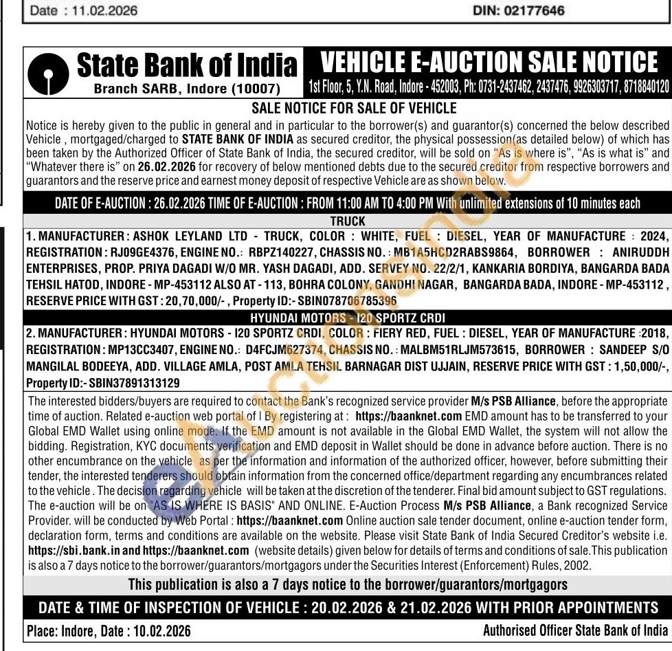 MANUFACTURER: HYUNDAI MOTORS - 120 SPORTZ CRDI, COLOR: FIERY RED, FUEL: DIESEL, YEAR OF MANUFACTURE: 2018, REGISTRATION: MP13CC3407, ENGINE NO.: D4FCJM627374, CHASSIS NO.: MALBM51RLJM573615, BORROWER: SANDEEP S/O MANGILAL BODEEYA, ADD. VILLAGE AMLA, POST AMLA TEHSIL BARNAGAR DIST UJJAIN,