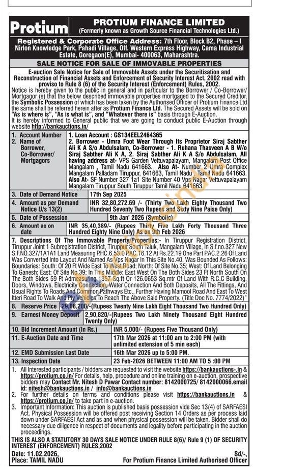 7. Descriptions Of The Immovable Property/Properties: In Tiruppur Registration District, Tiruppur Joint 1 Subregistration District, Tiruppur South Taluk, Mangalam Village, In S.f.no.327 New S.F.NO.327/1A1A1 Land Measuring P.HC.6.53.0 P.AC.16.12 At Rs.22.19 One Part P.AC.2.26 Of Land Was Converted Into Layout And Named As Vps Nagar In This Site No.40. Was Bounded As Follows: Boundaries: South: Of 20 Ft Wide East To West Road; North: Of Site No.35; West: Of Land Belonging To Ganesh; East: Of Site No.39; In This Middle: East West On The Both Sides 23 Ft North South On The Both Sides 59 Ft Admeasuring 1357 Sq.ft Or 126.0653 Sq.mtr Of Land With R.C.C Building, Doors, Windows, Electricity Connection, Water Connection And Both Deposits, All The Fittings, And Usual Rights To Roads And Common Pathways Etc., Further Having Mamool Road And East To West Itteri Road To Walk And Ply Vehicles To Reach The Above Said Property. (Title Doc No. 7774/2022)"