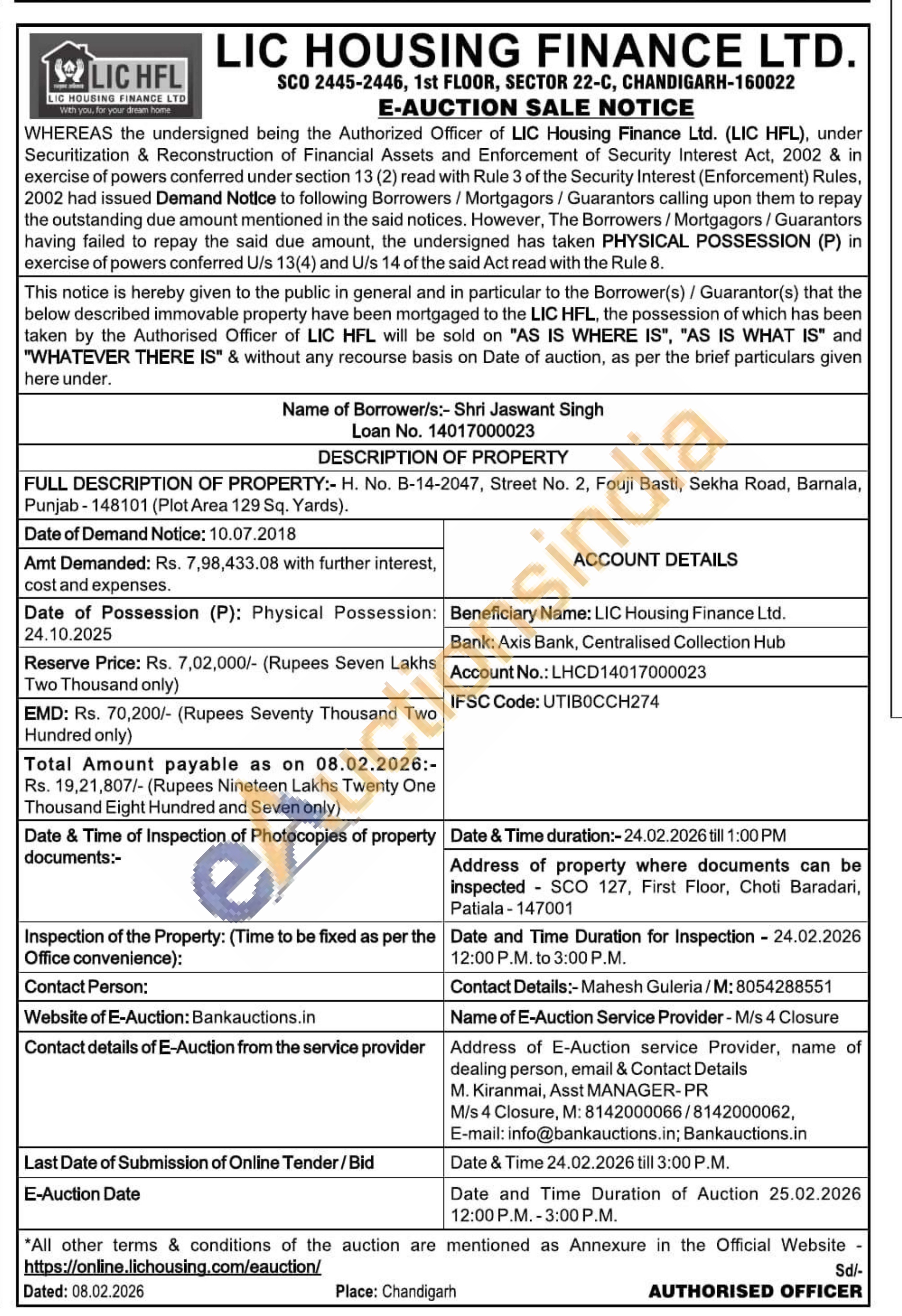 FULL DESCRIPTION OF PROPERTY:- H. No. B-14-2047, Street No. 2, Fouji Basti, Sekha Road, Barnala, Punjab-148101 (Plot Area 129 Sq. Yards).