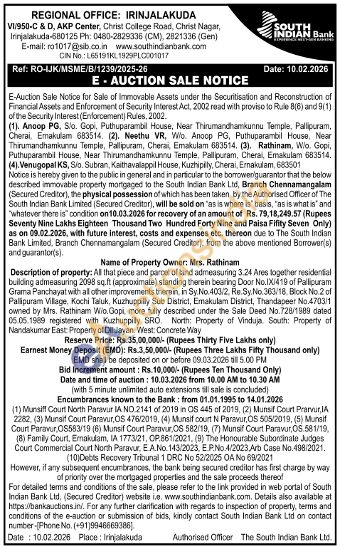 Description of property: All that piece and parcel of land admeasuring 3.24 Ares together residential building admeasuring 2098 sq.ft (approximate) standing therein bearing Door No.IX/419 of Pallipuram Grama Panchayat with all other improvements therein, in Sy.No.403/2, Re.Sy. No.363/18, Block No.2 of Pallipuram Village, Kochi Taluk, Kuzhuppilly Sub District, Ernakulam District, Thandapeer No.4703/1 owned by Mrs. Rathinam W/o. Gopi, more fully described under the Sale Deed No.728/1989 dated 05.05.1989 registered with Kuzhuppilly SRO. North: Property of Vinduja. South: Property of Nandakumar East: Property of Dil Jayan, West: Concrete Way