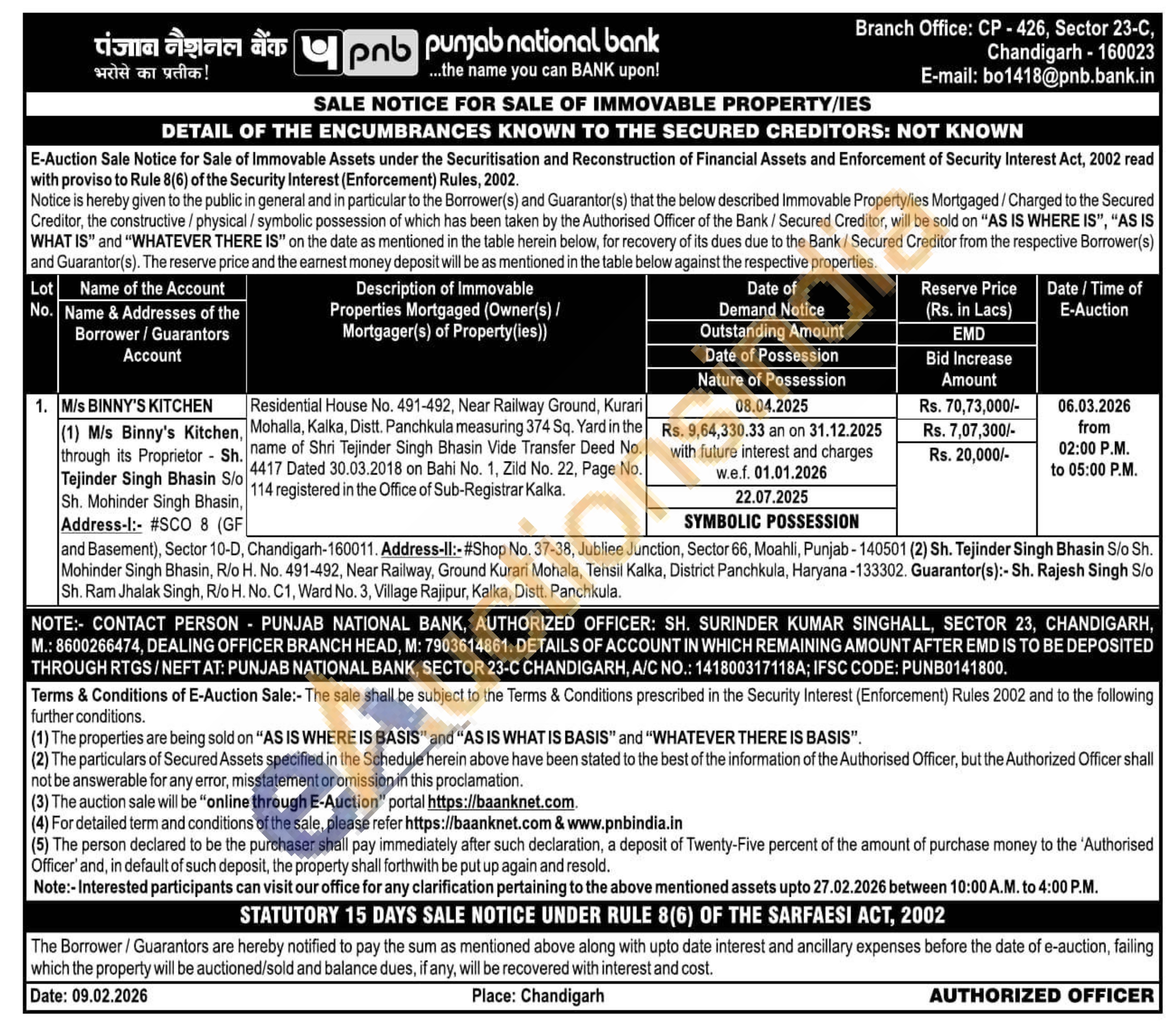 AUTHORIZED OFFICER: SH. SURINDER KUMAR SINGHALL, SECTOR 23, CHANDIGARH Mobile No : 8600266474 / DEALING OFFICER BRANCH HEAD Mobile No : 7903614861