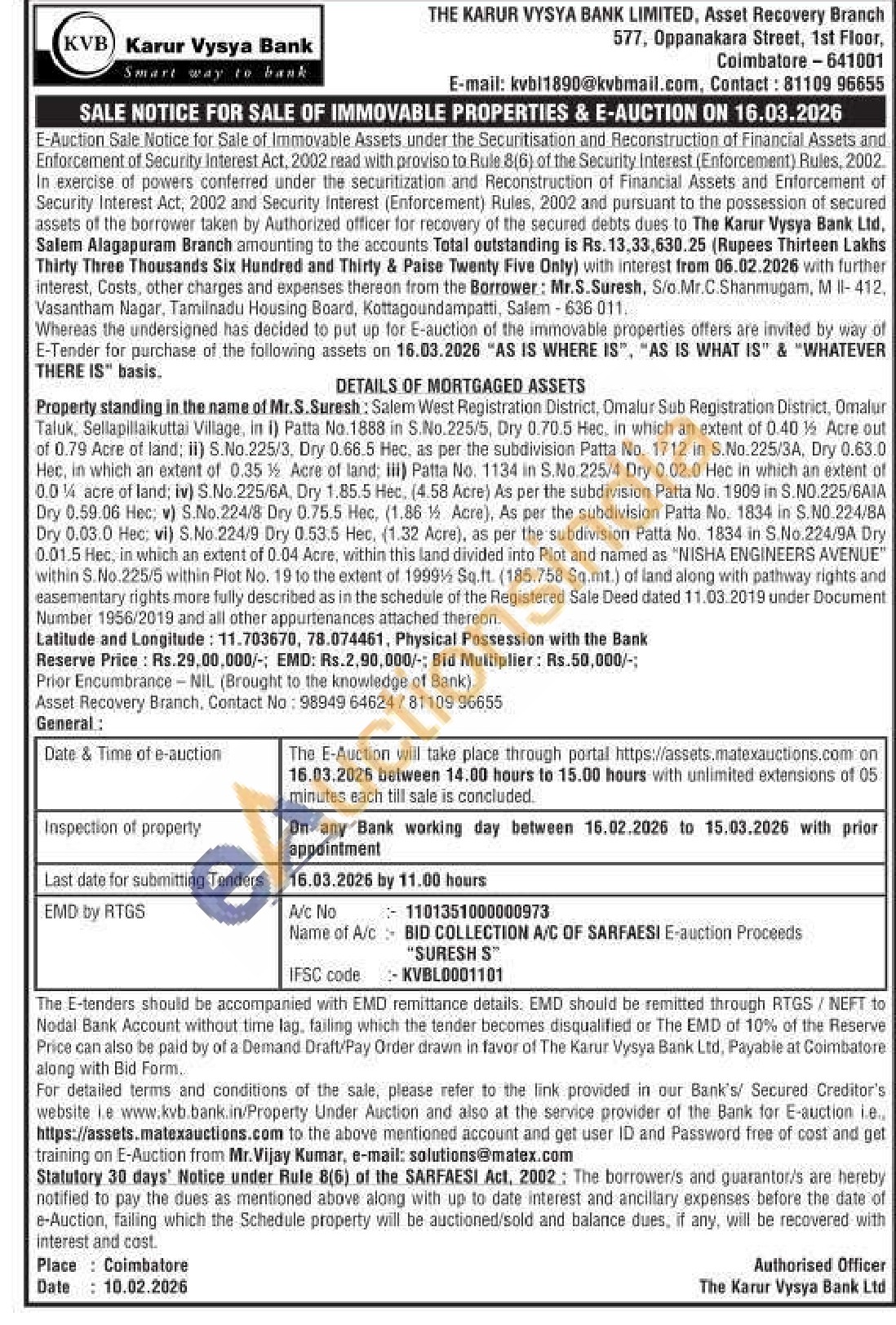 Property standing in the name of Mr.S.Suresh: Salem West Registration District, Omalur Sub Registration District, Omalur Taluk, Sellapillaikuttai Village, in i) Patta No.1888 in S.No.225/5, Dry 0.70.5 Hec, in which an extent of 0.40 15 Acre out of 0.79 Acre of land; ii) S.No.225/3, Dry 0.66.5 Hec, as per the subdivision Patta No. 1712 in S.No. 225/3A, Dry 0.63.0 Hec, in which an extent of 0.35% Acre of land; iii) Patta No. 1134 in S.No.225/4 Dry 0.02.0 Hec in which an extent of 0.014 acre of land; iv) S.No.225/6A, Dry 1.85.5 Hec, (4.58 Acre) As per the subdivision Patta No. 1909 in S.NO.225/6AIA Dry 0.59.06 Hec; v) S.No. 224/8 Dry 0.75.5 Hec, (1.86 14 Acre), As per the subdivision Patta No. 1834 in S.NO.224/8A Dry 0.03.0 Hec; vi) S.No.224/9 Dry 0.53.5 Hec. (1.32 Acre), as per the subdivision Patta No. 1834 in S.No.224/9A Dry 0.01.5 Hec, in which an extent of 0.04 Acre, within this land divided into Plot and named as "NISHA ENGINEERS AVENUE" within S. No.225/5 within Plot No. 19 to the extent of 1999 Sq.ft. (185.758 Sq.mt.) of land along with pathway rights and easementary rights more fully described as in the schedule of the Registered Sale Deed dated 11.03.2019