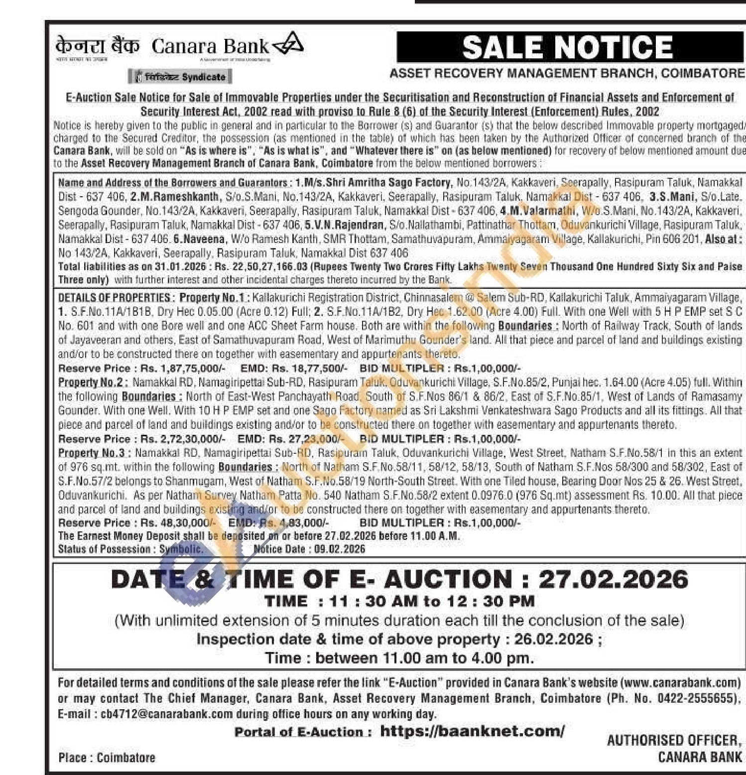 DETAILS OF PROPERTIES: Property No.1: Kallakurichi Registration District, Chinnasalem @ Salem Sub-RD, Kallakurichi Taluk, Ammaiyagaram Village, 1. S.F.No.11A/181B, Dry Hec 0.05.00 (Acre 0.12) Full; 2. S.F.No.11A/182, Dry Hec 1.62.00 (Acre 4.00) Full. With one Well with 5 HP EMP set S C No. 601 and with one Bore well and one ACC Sheet Farm house. Both are within the following Boundaries: North of Railway Track, South of lands of Jayaveeran and others, East of Samathuvapuram Road, West of Marimuthu Gounder's land. All that piece and parcel of land and buildings existing and/or to be constructed there on together with easementary and appurtenants thereto.