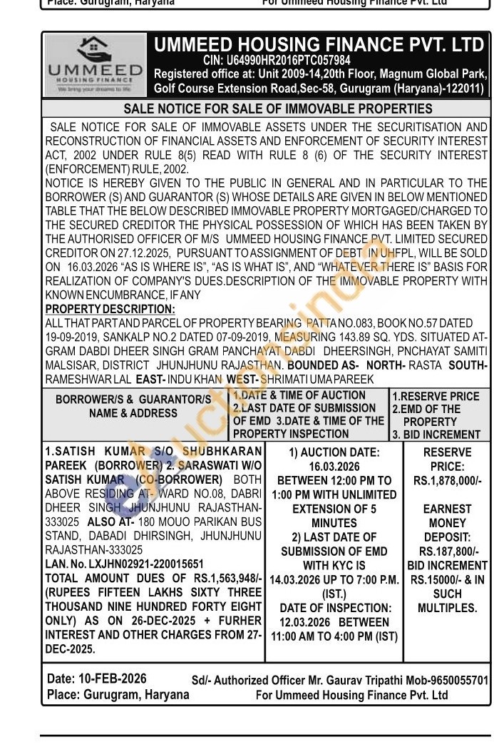 ALL THAT PARTAND PARCEL OF PROPERTY BEARING PATTA NO.083, BOOK NO.57 DATED 19-09-2019, SANKALP NO.2 DATED 07-09-2019, MEASURING 143.89 SQ. YDS. SITUATED AT-GRAM DABDI DHEER SINGH GRAM PANCHAYAT DABDI DHEERSINGH, PNCHAYAT SAMITI MALSISAR, DISTRICT JHUNJHUNU RAJASTHAN. BOUNDED AS- NORTH-RASTA SOUTH-RAMESHWAR LAL EAST-INDU KHAN WEST-SHRIMATI UMA PAREEK
