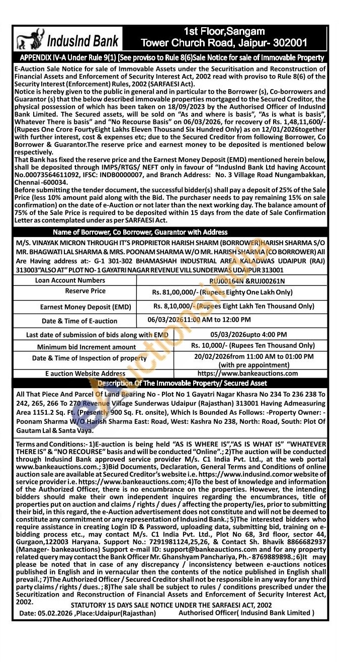 All That Piece And Parcel Of Land Bearing No - Plot No 1 Gayatri Nagar Khasra No 234 To 236 238 Το 242, 265, 266 Τo 270 Revenue Village Sunderwas Udaipur (Rajasthan) 313001 Having Admeasuring Area 1151.2 Sq. Ft. (Presently 900 Sq. Ft. onsite), Which Is Bounded As Follows: -Property Owner:-Poonam Sharma W/O Harish Sharma East: Road, West: Kashra No 238, North: Road, South: Plot Of Gautam Lal & Santa Vaya.