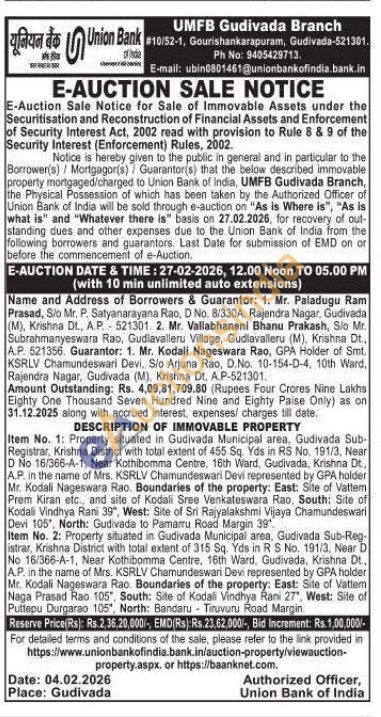 Item No. 1: Property situated in Gudivada Municipal area, Gudivada Sub-Registrar, Krishna District with total extent of 455 Sq. Yds in RS No. 191/3, Near D No 16/366-A-1, Near Kothibomma Centre, 16th Ward, Gudivada, Krishna Dt., A.P. in the name of Mrs. KSRLV Chamundeswari Devi represented by GPA holder Mr. Kodali Nageswara Rao, Boundaries of the property: East: Site of Vattem Prem Kiran etc., and site of Kodali Sree Venkateswara Rao, South: Site of Kodali Vindhya Rani 39", West: Site of Sri Rajyalakshmi Vijaya Chamundeswari Devi 105", North: Gudivada to Pamarru Road Margin 39". Item No. 2: Property situated in Gudivada Municipal area, Gudivada Sub-Reg-istrar, Krishna District with total extent of 315 Sq. Yds in R S No. 191/3, Near D No 16/366-A-1, Near Kothibomma Centre, 16th Ward, Gudivada, Krishna Dt., A.P. in the name of Mrs. KSRLV Chamundeswari Devi represented by GPA holder Mr. Kodali Nageswara Rao. Boundaries of the property: East: Site of Vattem Naga Prasad Rao 105", South: Site of Kodali Vindhya Rani 27", West: Site of Puttepu Durgarao 105", North: Bandaru Tiruvuru Road Margin