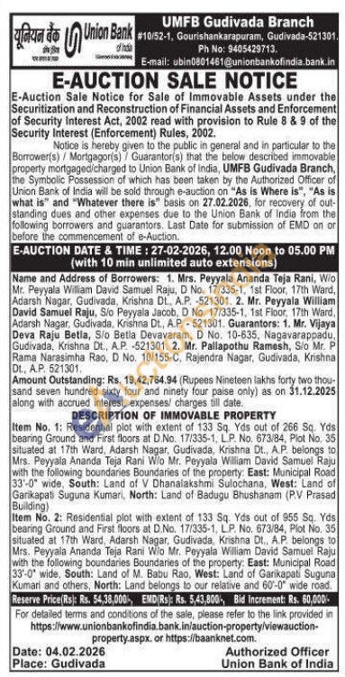 Item No. 1: Residential plot with extent of 133 Sq. Yds out of 266 Sq. Yds bearing Ground and First floors at D.No. 17/335-1, L.P. No. 673/84, Plot No. 35 situated at 17th Ward, Adarsh Nagar, Gudivada, Krishna Dt., A.P. belongs to Mrs. Peyyala Ananda Teja Rani W/o Mr. Peyyala William David Samuel Raju with the following boundaries Boundaries of the property: East: Municipal Road 33-0" wide, South: Land of V Dhanalakshmi Sulochana, West: Land of Garikapati Suguna Kumari, North: Land of Badugu Bhushanam (P.V Prasad Building) Item No. 2: Residential plot with extent of 133 Sq. Yds out of 955 Sq. Yds bearing Ground and First floors at D.No. 17/335-1, L.P. No. 673/84, Plot No. 35 situated at 17th Ward, Adarsh Nagar, Gudivada, Krishna Dt., A.P. belongs to Mrs. Peyyaia Ananda Teja Rani Wio Mr. Peyyala William David Samuel Raju with the following boundaries Boundaries of the property: East: Municipal Road 33-0" wide. South: Land of M. Babu Rao, West: Land of Garikapati Suguna Kumari and others, North: Land belongs to our relative and 60-0" wide road