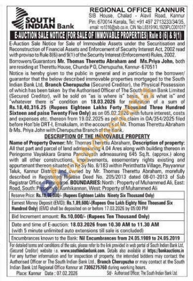 All that part and parcel of land admeasuring 4.04 Ares along with building thereon in Peringome Vayakkara Grama Panchayath admeasuring 645 Sq.ft. (approx.) along with all other constructions, improvements, easementary rights existing and appurtenant thereon situated in Re Sy No. 8/183 within Perinthatta Village, Payyannur Taluk, Kannur District and owned by Mr. Thomas Therettu Abraham, morefully described in Registered Release Deed No. 205/2013 dated 08-01-2013 of Sub Registrar Office-Peringome. BOUNDARIES: North: Property of Muhammed Ali, East: Road, South: Property of Kunhikannan, West: Property of Muhammed Ali