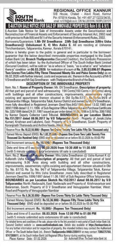 All that part and parcel of land admeasuring 9.06 Ares along with building and all other constructions, improvements, easementary rights existing and appurtenant thereon situated in Old Sy. No. 87/10, Re. Sy. No. 94/7 of Taliparamba Village, Taliparamba Taluk, Kannur District and owned by Mrs Usha Sreedharan, more fully described in Registered Jenman Deed No. 1896/1997 dated 11.06.1997 of Sub Registrar Office Taliparamba. BOUNDARIES as per Location Sketch No.152/2017 dated 08.06.2017 by V.O Taliparamba: North :Nadavazhi, East: Nadavazhi and Property of Krishnavariyar and Balararrian, South: Property of OV Sreedharan and Venugopalan Nambiar, West: Road and Property of Venugopalan Nambiar
