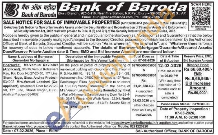 All the piece or parcel of property consisting of residential building with Ground and First Floor in R.S.No.98/10, 98/11, Door No.28-1-38. Assessment No. 1075027064 situated at 13th Road, Santhinagar, Eluru, Andhra Pradesh to an extent of 130 Sq. Yards, Standing in the name of Mrs. Vemuri Lakshmi is being Bounded by: East : Wall of Nimmana Sarojini bearing Door No.28-4-36-23.6 ft. West: 40 ft Width Road-22.0 ft, North Site of P.V.R.V.Prasad-51.3 Ft. South: Site of Uppu Ullaki-51.9 ft