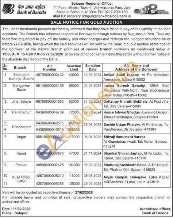 Bank of Baroda Gold Auctions Auction in Satara