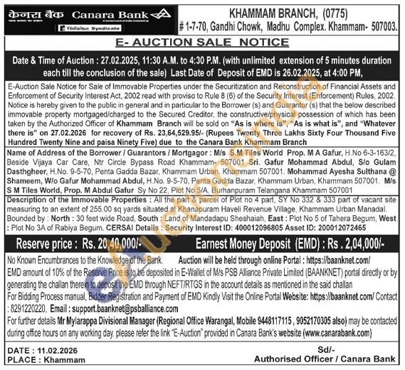 Description of the Immovable Properties: All the part & parcel of Plot no 4 part, SY No 332 & 333 part of vacant site measuring to an extent of 255.00 sq yards situated at Khanapuram Haveli Revenue Village, Khammam Urban Manadal. Bounded by North: 30 feet wide Road, South: Land of Mandadapu Sheshaiah, East: Plot No 5 of Tahera Begum, West Plot No 3A of Rabiya Begum. CERSAI Details: Security Interest ID: 400012096805 Asset ID: 200012072465