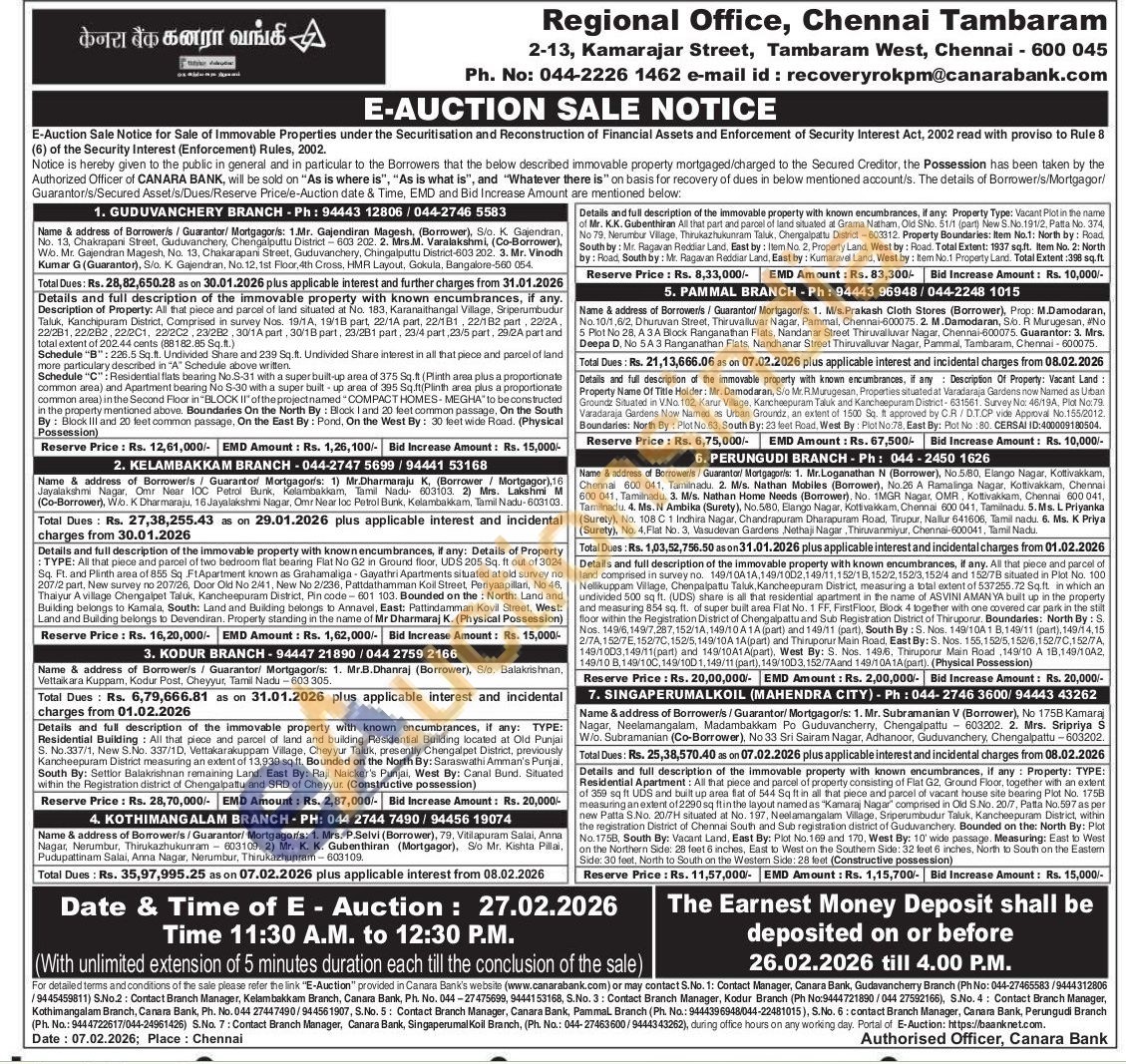 Description of Property: All that piece and parcel of land situated at No. 183, Karanaithangal Village, Sriperumbudur Taluk, Kanchipuram District, Comprised in survey Nos. 19/1A, 19/1B part, 22/1A part, 22/181, 22/1B2 part, 22/2A, 22/281, 22/282, 22/2C1, 22/2C2, 23/282, 30/1A part, 30/1B part, 23/281 part, 23/4 part, 23/5 part, 29/2A part and total extent of 202.44 cents (88182.85 Sq.ft.) Schedule "B": 226.5 Sq.ft. Undivided Share and 239 Sq.ft. Undivided Share interest in all that piece and parcel of land more particulary described in "A" Schedule above written. Schedule "C": Residential flats bearing No.S-31 with a super built-up area of 375 Sq.ft (Plinth area plus a proportionate common area) and Apartment bearing No S-30 with a super built-up area of 395 Sq.ft(Plinth area plus a proportionate common area) in the Second Floor in "BLOCK II" of the project named "COMPACT HOMES-MEGHA" to be constructed in the property mentioned above. Boundaries On the North By: Block I and 20 feet common passage, On the South By: Block III and 20 feet common passage, On the East By: Pond, On the West By: 30 feet wide Road. (Physical Possession)