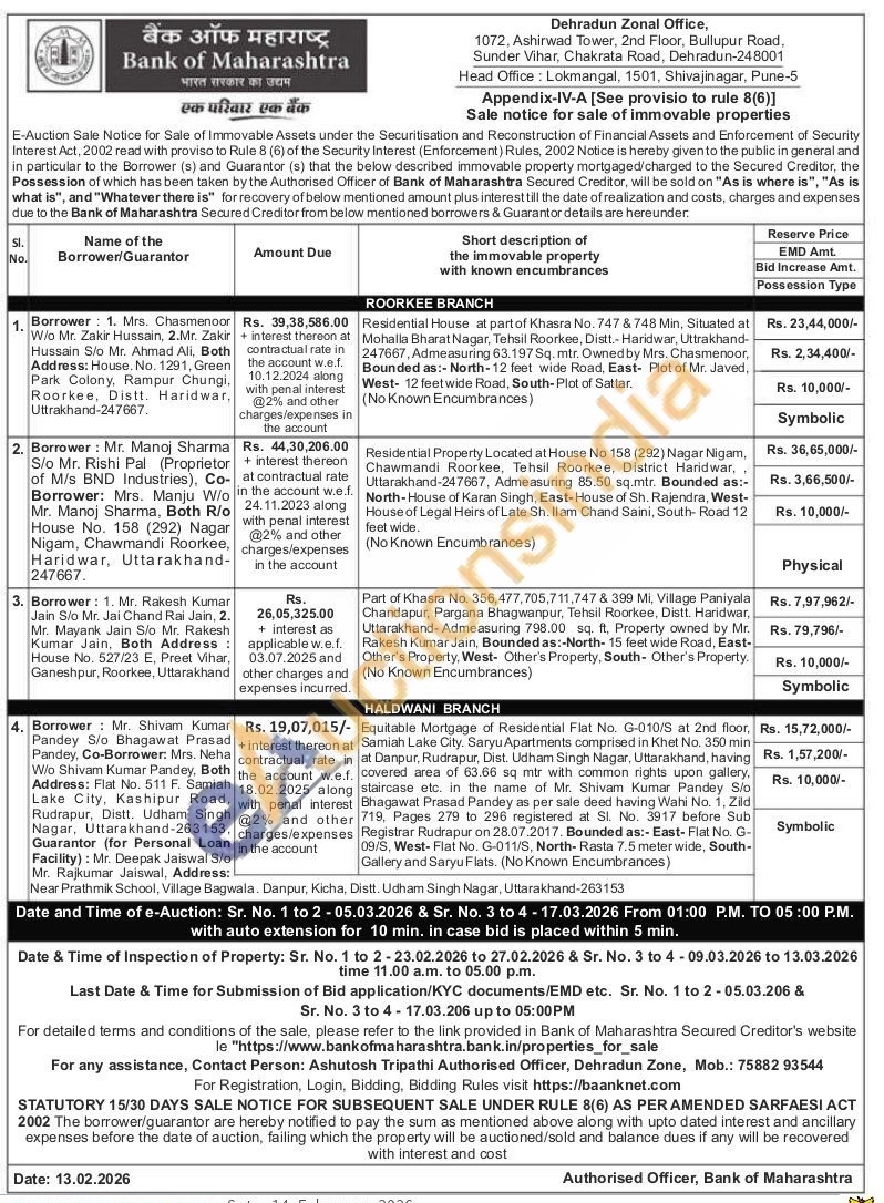 Part of Khasra No. 356,477,705,711,747 & 399 Mi, Village Paniyala Chandapur, Pargana Bhagwanpur, Tehsil Roorkee, Distt. Haridwar, Uttarakhand- Admeasuring 798.00 sq. ft, Property owned by Mr. Rakesh Kumar Jain, Bounded as:-North-15 feet wide Road, East-Other's Property, West- Other's Property, South Other's Property. (No Known Encumbrances)