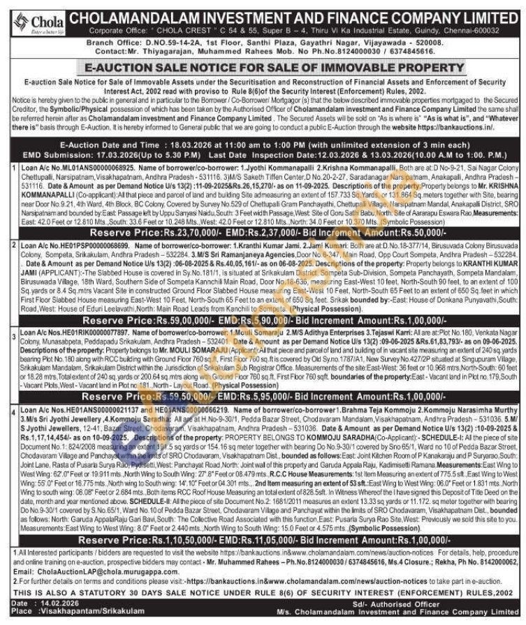 All that piece and parcel of land and building of in vacant site measuring an extent of 240 sq yards bearing Plot No. 180 along with RCC building with Ground Floor 760 sq.ft, First Floor 760 sq ft is covered by Old Sy.no. 1787/A1, New Survey No.427/2P situated at Singupuram Village, Srikakulam Mandalam, Srikakulam District within the Jurisdiction of Srikakulam Sub Registrar Office. Measurements of the site East-West 36 feet or 10.968 mtrs, North-South: 60 feet or 18.28 mtrs, Total extent of 240 sq yards or 200.64 sq mtrs along with Ground Floor 760 sq ft. First Floor 760 sqft, boundaries of the property East-Vacant land in Plot no 179, South -Vacant Plots, West-Vacant land in Plot no. 181., North-Layout Road (Physical Possession)