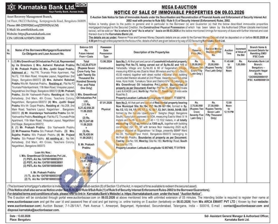 Item No.2: All that part and parcel of Residential property bearing Now Municipal Site No.184, PID No.39-187-184, formed in Sy. No. 1/2, 1/3, 1/4, 1/5, 1/6, 1/7, 2, 10, 50/1, 53, 54/1, 54/4A, 54/48, 55/5 formed by the Kendra Upadhyayara Sangha (Regd. Bangalore South), layout plan approved by BDA, measuring East to West: 914 meters and North to South: (13.40 13.1012 meters, in all totally measuring 121.20 sq.meters Le. 1305 sq.ft., together with building constructed (GF, FF, SF with terrace floor measuring 2520 sq.ft) thereon situated at Nagarabhavi 1st Stage, presently BBMP Ward No 39. Yeshwanthpur Hobli, Bangalore-560072 belonging to Mr. Prakash Prabhu. Boundaries of property as per Document: East by: Site No. 185, West by: Site No. 183, North by: Road, South by: Site No. 175. Property Location: Latitude & Longitude: 12.957405, 77.517919