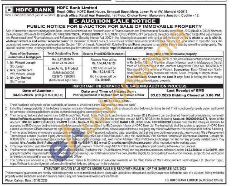 Item No. 1: All the pieces & parcel of 58 Cents of Residential land and building in Re Sy No 439/1 of Nilambur village, Nilambur taluk in Malappuram District more or fully described in the Jenmum Assignment Deed No. 1095/2006 of Nilambur SRO in the name of Vincent Boundaries: East-12 feet way, North-Road, West-Property of Anwar and others, South-Property of Mary Mathew