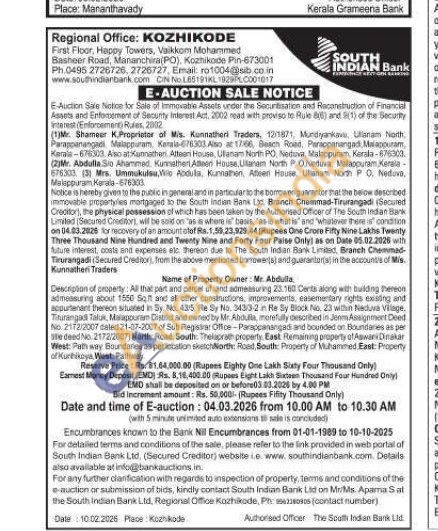 Description of property: All that part and parcer of land admeasuring 23.160 Derts along with building Thereon admeasuring about 1550 Soft and all other consinitions, improvements, easementary rights existing and appurtenant thereon siluated in Sy No. 43/5 Re Sy No. 3433-2 in Re Sy Block No. 23 within Naduva Village, Tirurangadi Talos, Malappuram District and owned by Mr. Abdulla, morefully described in Jem Assignment Deed No 2172/2007 dated 21-07-2007 of Sub Registrar Office-Parapcanangad and bounded on Bouridares as per Se deed No. 2172/2007) North North Road, South Thelaprath property, East Remaining property of Aswari Dinakar West: Path way Boundaries as per location sketch North: Road, South: Property of Muhammed East: Property of Kureikoya West: Pathway