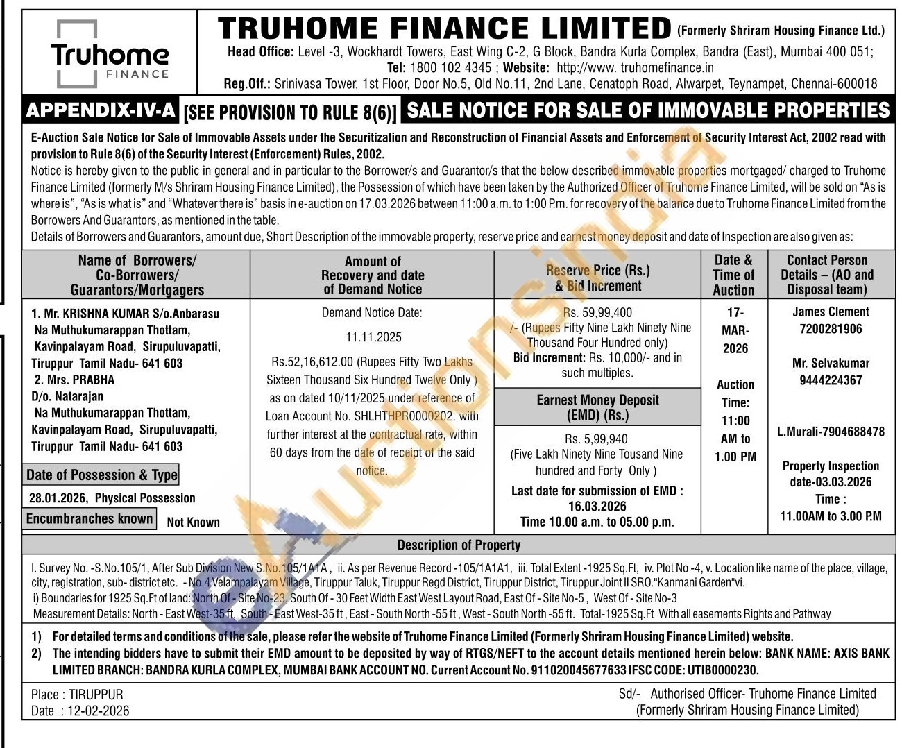 I. Survey No. -S.No. 105/1, After Sub Division New S.No. 105/1A1A, ii. As per Revenue Record-105/1A1A1, iii. Total Extent-1925 Sq. Ft, iv. Plot No-4, v. Location like name of the place, village, city, registration, sub-district etc. No.4 Velampalayam Village, Tiruppur Taluk, Tiruppur Regd District, Tiruppur District, Tiruppur Joint II SRO."Kanmani Garden"vi. i) Boundaries for 1925 Sq. Ft of land: North Of-Site No-23, South Of-30 Feet Width East West Layout Road, East Of-Site No-5, West Of-Site No-3 Measurement Details: North-East West-35 ft, South-East West-35 ft, East-South North-55 ft, West-South North-55 ft. Total-1925 Sq. Ft With all easements Rights and Pathway