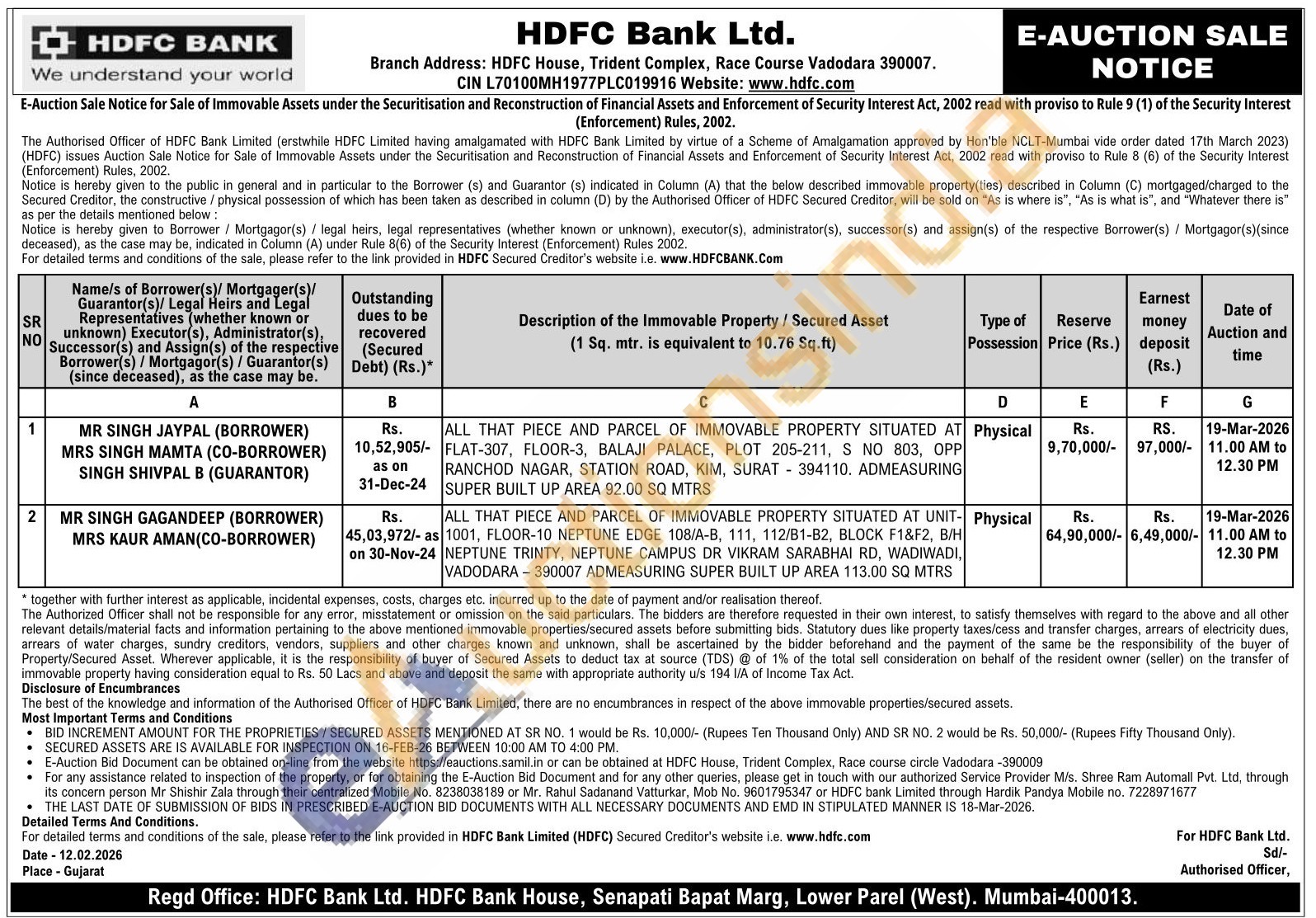 ALL THAT PIECE AND PARCEL OF IMMOVABLE PROPERTY SITUATED AT FLAT-307, FLOOR-3, BALAJI PALACE, PLOT 205-211, S NO 803, OPP RANCHOD NAGAR, STATION ROAD, KIM,Char SURAT 394110. ADMEASURING SUPER BUILT UP AREA 92.00 SQ MTRS