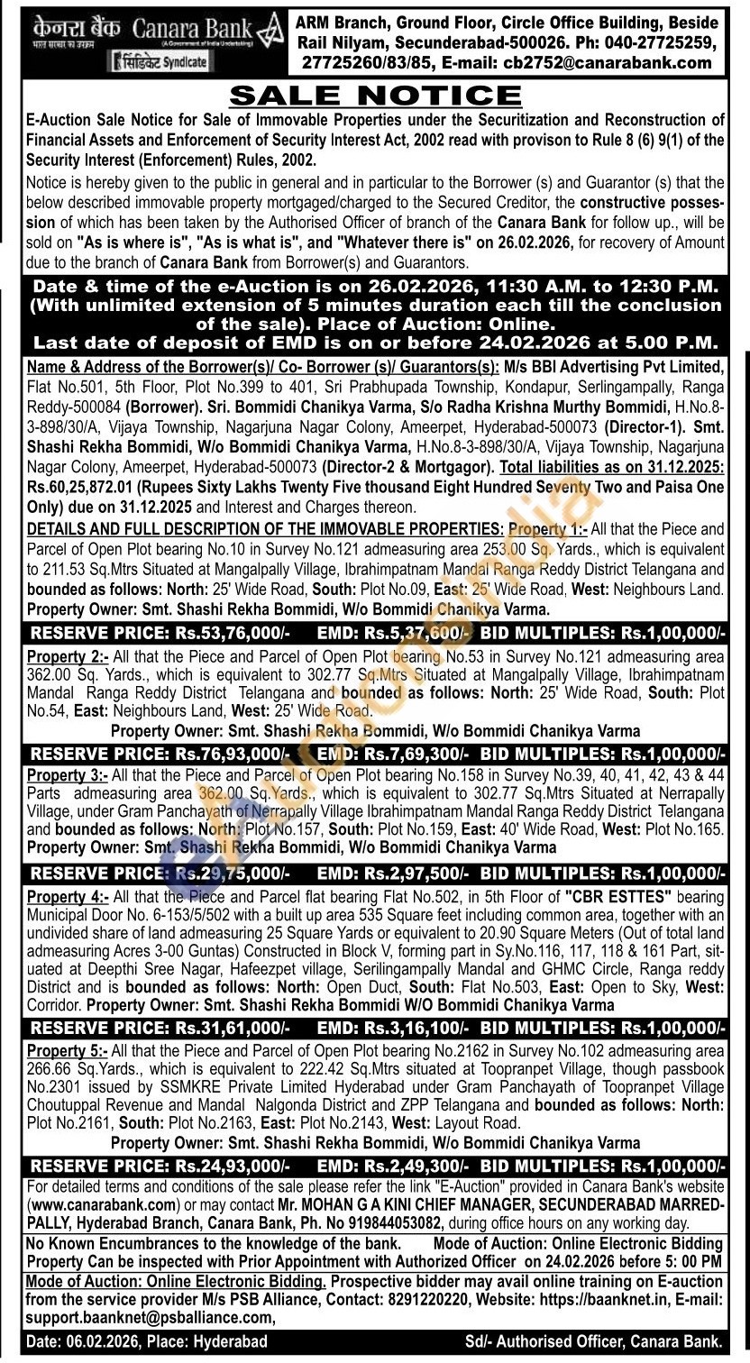 Property 5:- All that the Piece and Parcel of Open Plot bearing No.2162 in Survey No.102 admeasuring area 266.66 Sq. Yards., which is equivalent to 222.42 Sq.Mtrs situated at Toopranpet Village, though passbook No.2301 issued by SSMKRE Private Limited Hyderabad under Gram Panchayath of Toopranpet Village Choutuppal Revenue and Mandal Nalgonda District and ZPP Telangana and bounded as follows: North: Plot No.2161, South: Plot No.2163, East: Plot No.2143, West: Layout Road.
