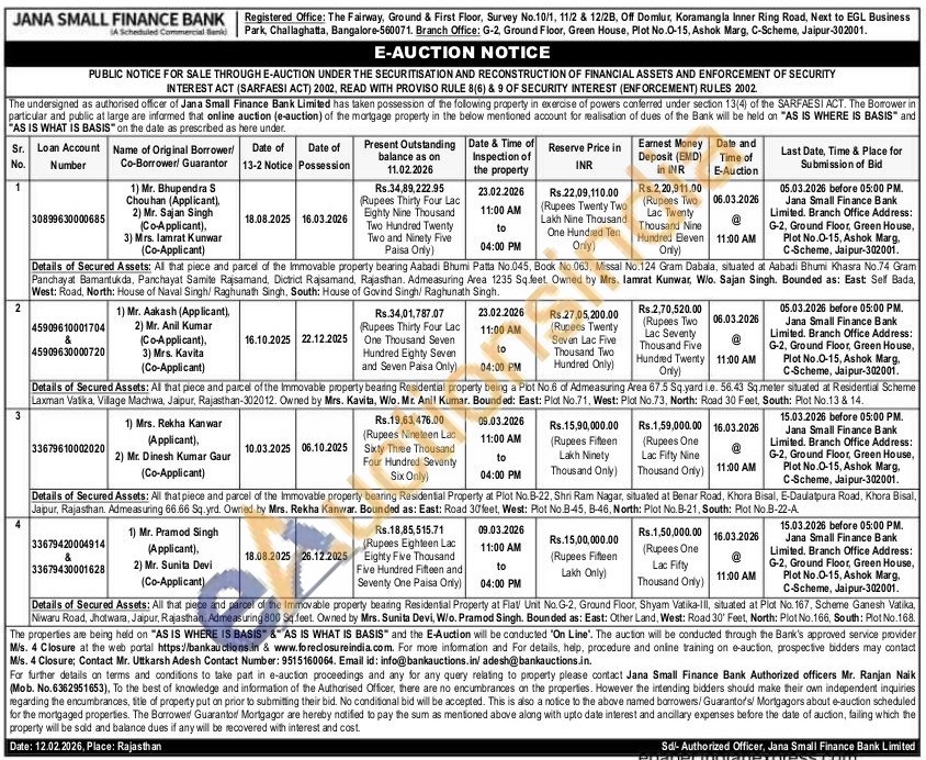 Details of Secured Assets: All that piece and parcel of the immovable property bearing Residential Property at Plot No. B-22, Shri Ram Nagar, situated at Benar Road, Khora Bisal, E-Daulatpura Road, Khora Bisal, Jaipur, Rajasthan. Admeasuring 66.66 Sq.yrd. Owned by Mrs. Rekha Kanwar. Bounded as: East: Road 30 feet, West: Plot No.B-45, B-46, North: Plot No. B-21, South: Plot No.B-22-A