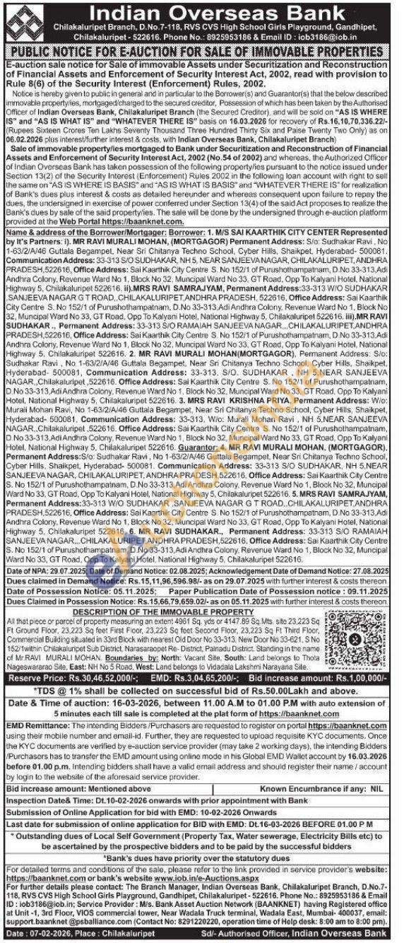 MR RAVI MURALI MOHAN, (MORTGAGOR) Permanent Address: 5/0 Sudhakar Flavi, No 1-63/2/A/46 Gutlala Begampet, Near Sri Chitanya Techno School, Cyber Hills, Shaikpet, Hyderabad-500081 Communication Address: 33-313 S/O SUDHAKAR, NHS, NEAR SANJEEVANAGAR, CHILAKALURIPET, ANDHRA PRADESH 522616, Office Address: Sai Kaarthik City Centre 5 No 152/1 of Purushothampatham, D.No 33-313,Adi Andhra Colony, Revenue Vard No 1. Block No 32. Muncipal Ward No 33. GT Road, Opp To Kalyani Hotel, National Highway 5. Chitalkaluripet 522616 ) MRS RAVI SAMRAJYAM, Permanent Address:33-313 W/O SUDHAKAR SANJEEVA NAGAR GT ROAD, CHILAKALURIPET ANDHRA PRADESH, 522616, Office Address: Sai Kaarthak City Centre S. No 152/1 of Purushothampatnam, D.No 33-313, Adi Andhra Colony, Revenue Ward No 1, Block No 32. Muncipal Ward No 33. GT Road. Opp To Kalyani Hotel, National Highway 5, Chilakaluripet 522616, .MR RAVI SUDHAKAR., Permanent Address: 33-313 SIO RAMAIAH SANJEEVA NAGAR CHILAKALURIPET ANDHRA PRADESH,522016. Office Address: Sal Kaarthik City Centre 5. No 152/1 of Purushothampatnam, D.No 33-313.Ad Andhra Colony, Revenue Ward No 1, Block No 32, Munopal Ward No 33. GT Roed. Opp To Kalyani Hotel, National Highway 5, Chilakaluripet 522616. 2. MR RAVI MURALI MOHAN(MORTGAGOR), Permanent Address: Sio Sudhakar Ravi, No 1-63/2/A/46 Guttala Begampet, Near Sri Chitanya Techno School, Cyber Hills, Shaikpet, Hyderabad-500081, Communication Address: 33-313, S/O, SUDHAKAR, NH 5. NEAR SANJEEVA NAGAR, Chilakaturipet, 522616. Office Address: Sai Kaarthik Cry Centre S. No 152/1 of Purushothampatnare, D. No 33-313,Adi Andhra Colony, Revenue Ward No 1. Block No 32, Muncipal Ward No 35. GT Road. Opp To Kalyani Hotel National Highway 5. Chilakaluripet S 5. Chilakaluripet 522616 3. MRS RAVI KRISHNA PRIYA. PRIYA, Permanent Address: Wia Murali Mohan Ravi, No 1-63/2/A/46 Guttala Begampet, Near Sri Chitanya Techno School, Cyber Hills, Shaikpet, Hyderabad- 600081, Communication Address: 33-313, Wio. Marall Mohan Ravi, NH 5 NEAR SANJEEVA NAGAR Chitakaturipet 522616. Office Address: Sai Kaarthik City Centre 8. No 152/1 of Purushothampatnam, No 33-313.Adi Andhra Colony, Revenue Wand No 1, Block No 32, Muncipal Ward No 33, GT Road. Opp To Kalyani Hotel, National Highway 5. Chilakaluripet 522016. Quarantor: 4. MR RAVI MURALI MOHAN. (MORTGAGOR) Permanent Address:Sio: Sudhakar Ravi, No 1-63/2/4/46 Guttala Begampet, Near Sri Chitanya Techno School, Cyber Hills. Shaikpet, Hyderabad- 500001. Communication Address: 33-313 S/O SUDHAKAR, NH 5.NEAR SANJEEVA NAGAR, CHILAKALURIPET, ANDHRA PRADESH, 522616. Office Address: Sai Kaarthik City Centre S. No 152/1 of Purushothampatnam, D.No 33-313, Adi Andina Colony, Revenue Ward No 1, Block No 32, Muncipal Ward No 33, GT Road, Opp To Kalyani Hosel, National Highway 5, Chilakaluripet 522616.5. MRS RAVI SAMRAJYAM, Permanent Address:33-313 WIO SUDHAKAR SANJEEVA NAGAR GT ROAD CHILAKALURIPET ANDHRA PRADESH 522616. Office Address: Sai Kaarthik Cay Centre 5. No 152/1 of Purushothampatnam, D.No 33-313.Adi Andhra Colony. Revenue Ward No 1. Block No 32. Muncipal Ward No 33, GT Road, Opp To Kayani Hotel, National Highway 5, Chilakaluripet 522016. 6. MR RAVI SUDHAKAR, Permanent Address: 33-313 S/O RAMAIAH SANJEEVANAGAR CHILAKALURIPET ANDHRA PRADESH, 522616, Office Address: Sai Kaarthik City Centre S.No 152/1 of Purushothampatnam, D.No 33-313, Adi Andhra Colony, Revenue Ward No 1, Block No 32, Muncipal Ward No 33, GT Road, Opp To Kalyani Hotel, National Highway 5. Chilakaluripet 522616