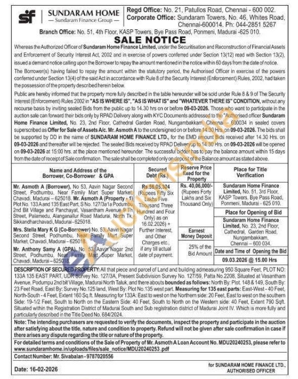 All that piece and parcel of Land and building admeasuring 950 Square Feet, PLOT NO: 133A 135 EAST PART, UDR Survey No. 127/3A, Present Subdivision Survey No. 127/59, Patta No.2208, Situated at Vasantham Avenue, Podumpu 2nd bit Village, Madurai North Taluk, and there abouts bounded as follows: North By: Plot. 148 & 149, South By: 23 Feet Road, East By: Survey No. 125 land, West By: Plot No.135 west part. Measuring for 135 east parts: East-West-40 Feet, North-South-4 Feet, Extent 160 Sq.ft. Measuring for 133A: East to west on the Northern side: 20 Feel, East to west on the southern Side: 19-1/2 Feet, South to North on the Eastem Side: 40 Feet, South to North on the Western side: 40 Feet, Extent 790 Sqft. Situated within the Registration District of Madurai South and Sub registration district of Madurai Joint IV. Which is more fully and particularly described in the Title Deed No. 684/2024