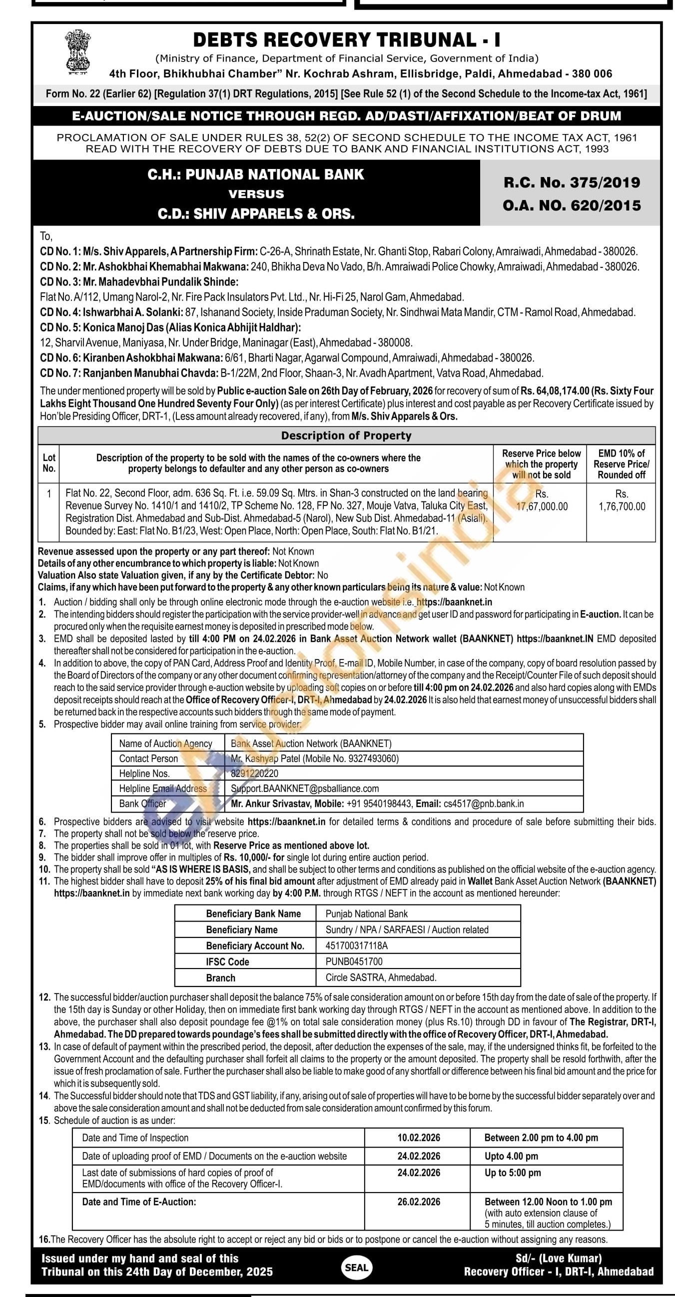 Flat No. 22, Second Floor, adm. 636 Sq. Ft. i.e. 59.09 Sq. Mtrs. in Shan-3 constructed on the land bearing Revenue Survey No. 1410/1 and 1410/2, TP Scheme No. 128, FP No. 327, Mouje Vatva, Taluka City East, Registration Dist. Ahmedabad and Sub-Dist. Ahmedabad-5 (Narol), New Sub Dist. Ahmedabad-11 (Aslali). Bounded by: East: Flat No. B1/23, West: Open Place, North: Open Place, South: Flat No. B1/21.