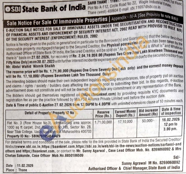 Flat No. 3 (Row House No.3), admeasuring area approx. 1000 sq ft carpet, 2nd Floor, Plot No.195, Sector No. 28. Near Tilak College, Vashi Navi Mumbai Maharashtra 400703 Property ID No:- SBIN200054640429