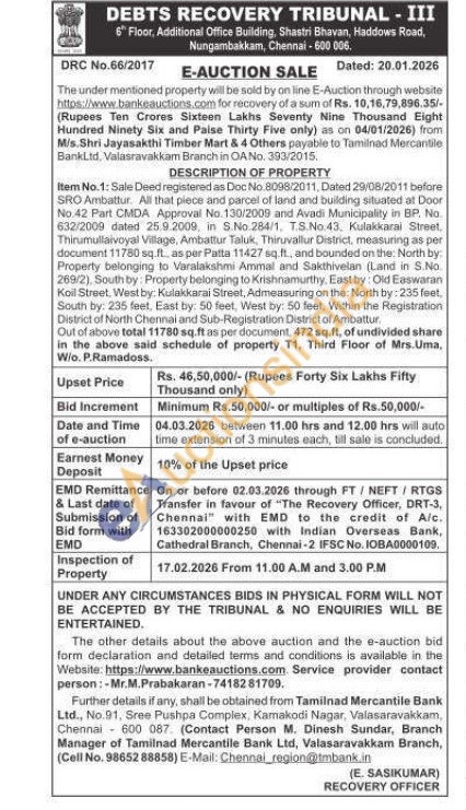 Item No.1: Sale Deed registered as Doc No.8098/2011, Dated 29/08/2011 before SRO Ambattur. All that piece and parcel of land and building situated at Door No.42 Part CMDA Approval No. 130/2009 and Avadi Municipality in BP. No. 632/2009 dated 25.9.2009, in S.No.284/1, T.S.No.43, Kulakkarai Street. Thirumullaivoyal Village, Ambattur Taluk, Thiruvallur District, measuring as per document 11780 sq.ft., as per Patta 11427 sq.ft., and bounded on the North by: Property belonging to Varalakshmi Ammal and Sakthivelan (Land in S.No. 269/2), South by: Property belonging to Krishnamurthy, East by: Old Easwaran Koil Street, West by: Kulakkarai Street, Admeasuring on the: North by: 235 feet, South by: 235 feet, East by: 50 feet, West by: 50 feet, Within the Registration District of North Chennai and Sub-Registration District of Ambattur, Out of above total 11780 sq.ft as per document, 472 sq.ft, of undivided share in the above said schedule of property T1. Third Floor of Mrs.Uma, W/o. P.Ramadoss.l