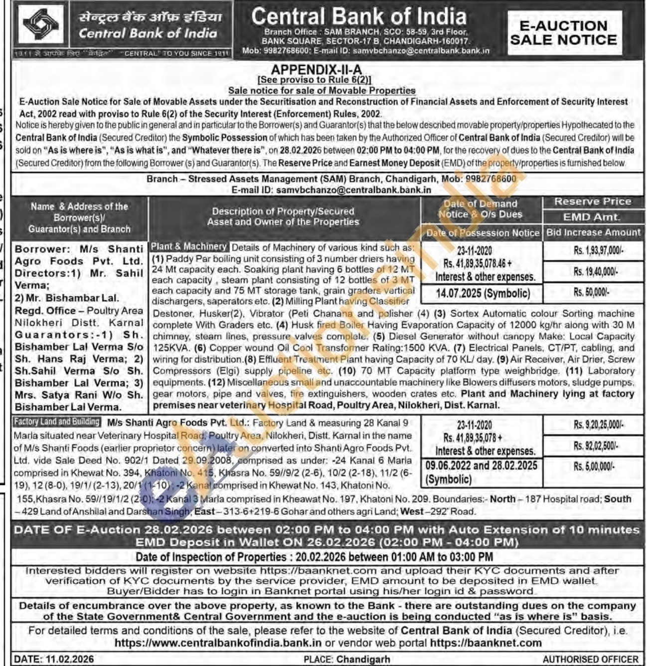 M/s Shanti Agro Foods Pvt. Ltd.: Factory Land & measuring 28 Kanal 9 Marla situated near Veterinary Hospital Road, Poultry Area, Nilokheri, Distt. Karnal in the name of M/s Shanti Foods (earlier proprietor concern) later on converted into Shanti Agro Foods Pvt. Ltd. vide Sale Deed No. 902/1 Dated 29.09.2008, comprised as under: -24 Kanal 6 Maria comprised in Khewat No. 394, Khatoni No. 415, Khasra No. 59//9/2 (2-6), 10/2 (2-18), 11/2 (19), 12 (8-0), 19/1/(2-13), 20/1 (1-10); -2 Kanal comprised in Khewat No. 143, Khatoni No.155, Khasra No. 59//19/1/2 (2-0); -2 Kanal 3 Marla comprised in Kheawat No. 197, Khatoni No. 209. Boundaries:- North-187 Hospital road; South -429 Land of Anshilal and Darshan Singh; East-313-6+219-6 Gohar and others agri Land; West-292 Road.