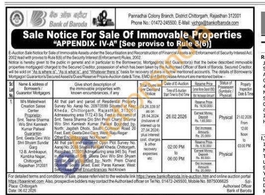 All that part and parcel of Open Plot Survey No Aani No. 2088 Situated at Keer Kheda. Chittorgarh, Rajasthan 312001 Admeasuring area 945 Sq Feet in the name of Smt. Geeta Devi Wo Shn Shyam Sunder Garg Bounded by North Prem Chand Sharma, South Road, East: Paras Kanwar. West: Serf House. Other Encumbrances Not Known